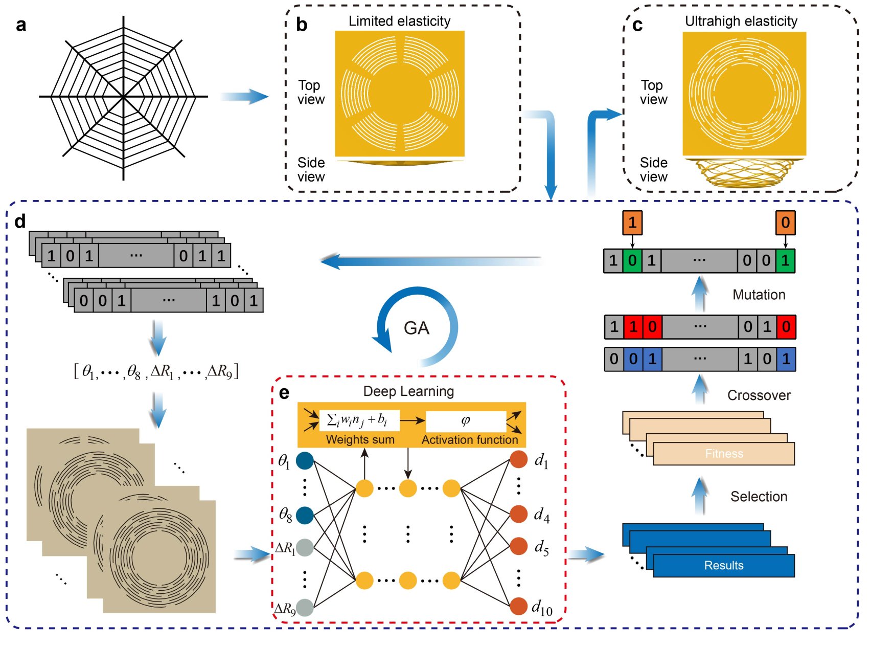 近日,必赢国际437官网必赢国际437官网/光电学院李家方教授研究团队提出了一种融合机器学习与纳米剪纸加工技术的创新研究思路,成功开发出一种具备力学超弹性和振动可分辨的人工微网。本工作通过将遗传算法与深度学习相结合,突破了传统仿生蛛网结构的力学弹性局限,并探索了其在超灵敏质量传感和振动信息加密方面的应用潜力,为微纳机械传感、微纳机电系统(MEMS/NEMS)、机械超材料、生物操控和信息加密等领域的研究提供了新的思路。该创新成果于近期发表于国际顶级刊物Advanced Materials(IF: 26.8)上。