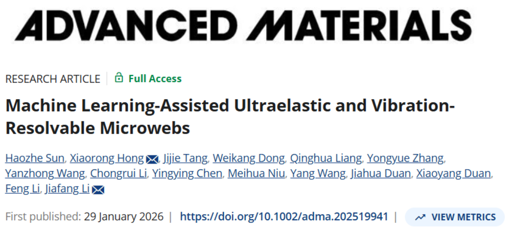 Haozhe Sun, Xiaorong Hong*, Jijie Tang, Weikang Dong, Qinghua Liang, Yongyue Zhang, Yanzhong Wang, Chongrui Li, Yingying Chen, Meihua Niu, Yang Wang, Jiahua Duan, Xiaoyang Duan, Feng Li, Jiafang Li*, “Machine learning-assisted ultraelastic and vibration-resolvable microwebs”, Advanced Materials, e19941 (2026).
