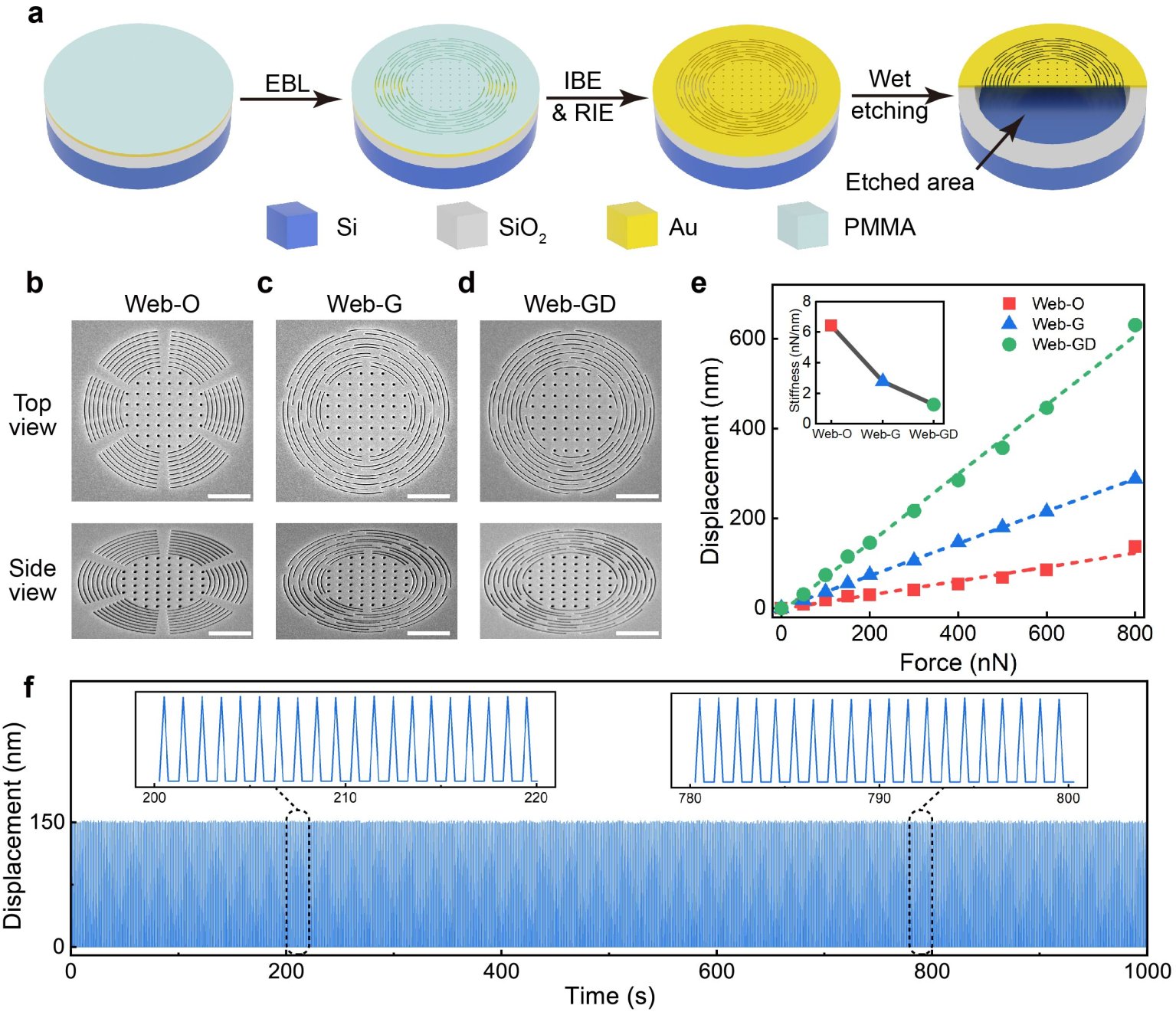“师法自然”的研究理念已逐步发展成为极具创造力的跨学科交叉研究范式,并显著赋能了结构工程、力/光学超材料及微操纵技术等领域的发展。其中,微纳尺度的仿生蛛网结构设计成为一个重要的实践范例,已在超灵敏力学传感器、可拉伸器件及机械谐振器等领域展现出了重要的应用潜力。然而,目前绝大多数的人工仿生蛛网结构设计仍存在力学弹性较弱的问题,这一缺陷限制了其在某些领域的力学性能发挥与多功能应用能力,尤其在微纳尺度应用场景中,精准制备并自由操控高机械弹性、形貌变换可控的仿生蛛网结构变得极具挑战性。因此,寻求有效设计方案并实现微纳尺度高弹性蛛网结构的制备,对于开发基于仿生学的高精度力学微传感器以及动态微机械器件至关重要。