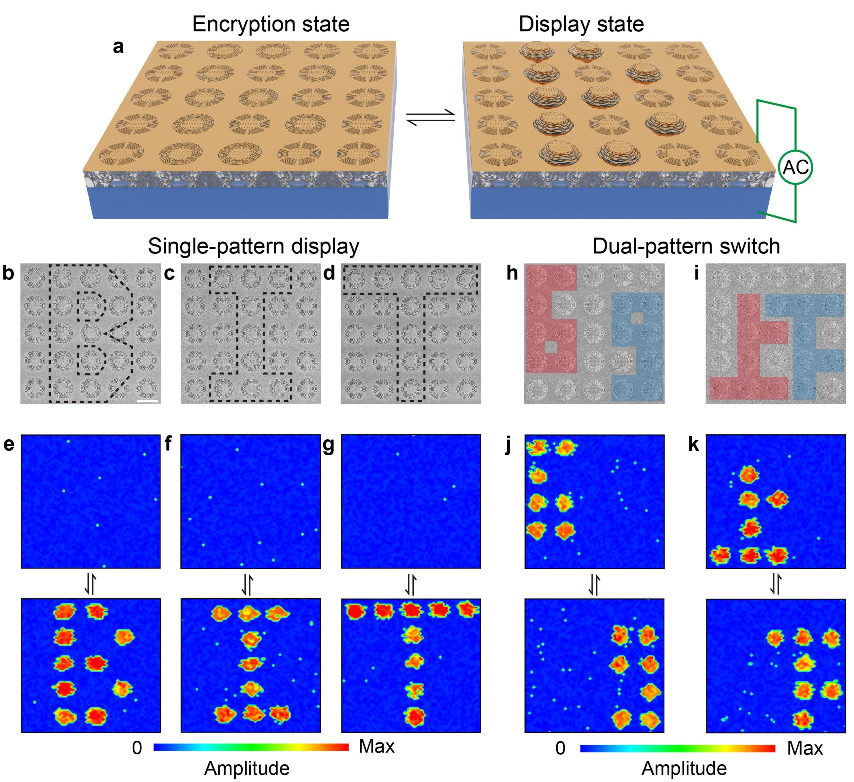 此外,在信息加密应用方面,研究团队基于微网振动“结构参数-力学刚度-共振响应”之间的映射规律,发现了优化前后微网结构刚度差异引起的共振特性(包括振幅和相位)变化等规律。基于该规律,通过巧妙地将多种结构进行编码设计和组合,实现了“特定振动”选择性激发“特定信息显示”的信息加密策略(如图4所示)。相比于传统光学加密对光学强度信息的依赖,这种基于微网振动可分辨的新型信息加密方案为MEMS兼容的多维信息安全策略研究提供了一种新的技术途径。