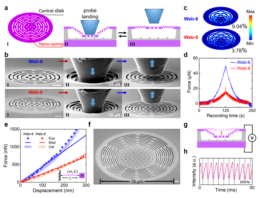 图3. 硅基网状纳米弹簧结构的弹性形变特性。