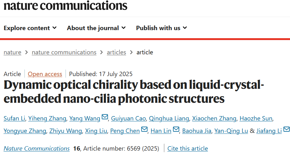 论文信息:Sufan Li#, Yiheng Zhang#, Yang Wang*, Guiyuan Cao, Qinghua Liang, Xiaochen Zhang, Haozhe Sun, Yongyue Zhang, Zhiyu Wang, Xing Liu, Peng Chen*, Han Lin*, Baohua Jia, Yan-Qing Lu, and Jiafang Li*, “Dynamic optical chirality based on liquid-crystal-embedded nano-cilia photonic structures”, Nat. Commun. 16, 6569 (2025).
