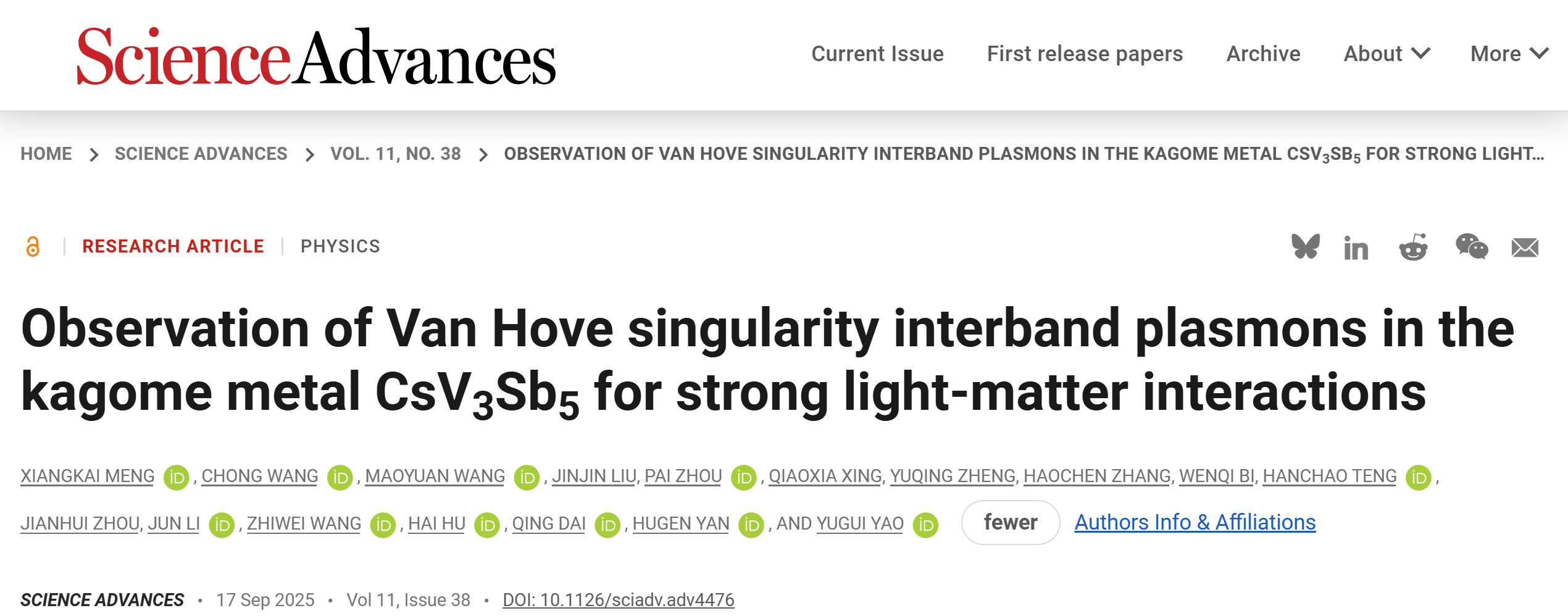日前,必赢国际437官网必赢国际437官网姚裕贵教授团队王冲副教授、王秩伟教授与复旦大学物理系的晏湖根教授团队、上海交通大学戴庆教授/国家纳米科学中心胡海研究员团队合作,通过低温显微红外光谱测量技术首次观测到了存在于笼目晶格材料CsV3Sb5薄膜中的范霍夫奇点带间跃迁等离激元(VHS interband plasmon)现象,实现了对等离激元与范霍夫奇点关联激发态间耦合的调控,为在关联电子体系材料中调控光与物质相互作用提供了新途径。相关研究题目为Observation of Van Hove singularity interband plasmons in the kagome metal CsV3Sb5 for strong light- matter interactions,成果被发表在期刊《Science Advances》上【Sci. Adv.11,eadv4476(2025)】。