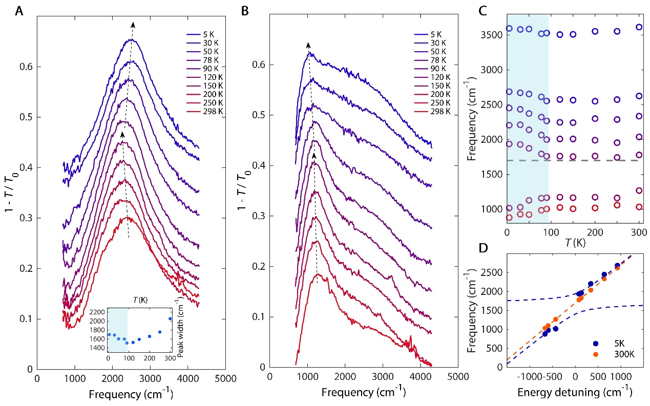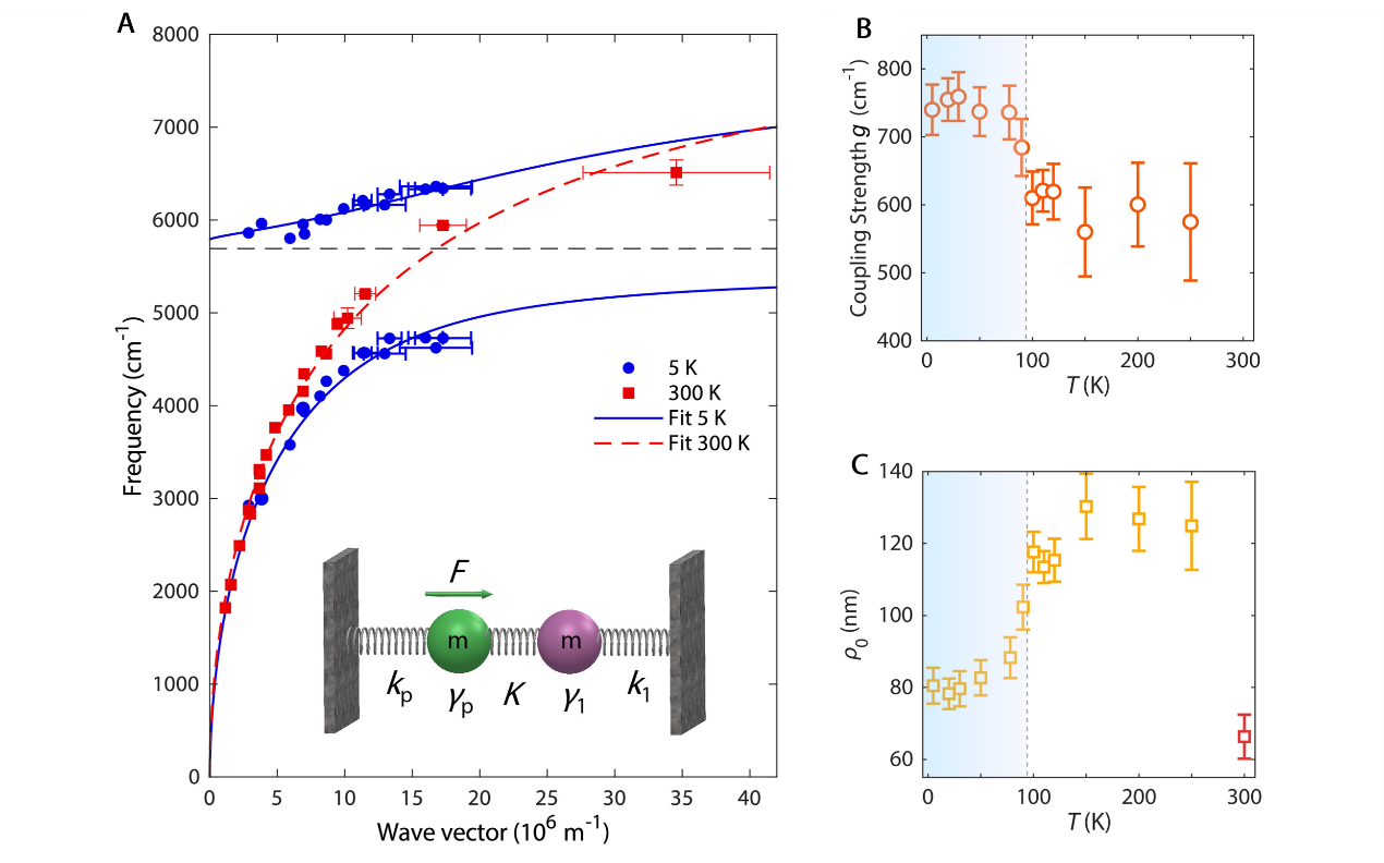 根据以上讨论启发,北理工研究团队通过对笼目金属CsV3Sb5进行机械剥离,成功制备出高质量二维薄膜,并在低温吸收光谱中观测到两个特征吸收峰,分别对应于电荷密度波激发态和范霍夫奇点处的带间跃迁吸收峰(图1)。为探究等离激元与电荷密度波激发态间的耦合现象,研究团队通过将等离激元器件制备在介电常数较低的单晶金刚石衬底上,并精确控制光栅条带的宽度,实现等离激元与电荷密度波激发态耦合模式的探测,发现了等离激元吸收峰受电荷密度波产生影响的异常展宽以及峰位移动现象(图2)。通过更换介电常数更高的CaF2衬底,研究团队将等离激元共振能量调制到范霍夫奇点处带间跃迁能量附近,在低温下成功观测到两者耦合所产生的杂化模式。图3A清晰的展示出在5K下色散曲线呈现的反交叉行为,研究团队将这种模式称为范霍夫奇点带间跃迁等离激元。通过变温实验测量并利用耦合谐振子模型进行分析,发现了耦合强度g在电荷密度波转变温度附近的强调制作用,并且屏蔽长度