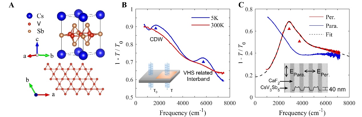 等离激元的激发、传导、探测和调控作为现代光子学的一个重要分支,在生物、化学、能源和信息等领域显示出重要的应用前景。当关联电子材料与等离激元相结合时,会表现出传统贵金属材料体系不具备的等离激元新颖性质,促进等离激元光电器件的应用发展。然而,关联电子材料等离激元的研究更多停留在理论层面,很多理论预言的新颖现象还有待实验探索。当其中的新颖量子现象与等离激元相互作用时,其性质会如何变化还是个未知领域。因此,寻找一种兼具本征关联性质和等离激元激发能力的材料体系,以研究不同关联电子性质下等离激元的响应行为,具有重要意义。近年来发现的笼目晶格材料CsV3Sb5为此提供了理想平台。该材料表现出丰富的关联量子态,包括电荷密度波、非常规超导以及反常霍尔效应等。这些现象被认为与费米能级附近范霍夫奇点的态密度发散密切相关。同时,它还具有较高的载流子浓度,适于开展远场红外光谱等实验探测,为理解关联体系中等离激元的产生与调控机制创造了优越条件。