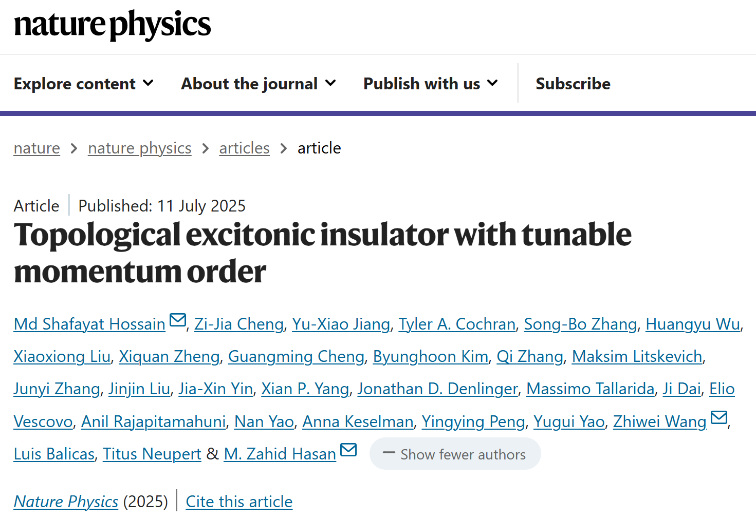 近日,必赢国际437官网必赢国际437官网王秩伟教授、姚裕贵教授团队与普林斯顿大学 M.Z.Hasan 团队合作,首次在三维晶体材料Ta₂Pd₃Te₅中实验观测到拓扑激子绝缘体的存在,并进一步发现其具有动量序可调的激子凝聚态。这一成果为探索关联电子体系中的拓扑量子态提供了全新平台。相关研究成果以“Topological excitonic insulator with tunable momentum order”为题发表在《Nature Physics》上。必赢国际437官网硕士生吴黄宇(现为北理工材料学院在读博士生)为论文共同第一作者,必赢国际437官网王秩伟教授为论文共同通讯作者。