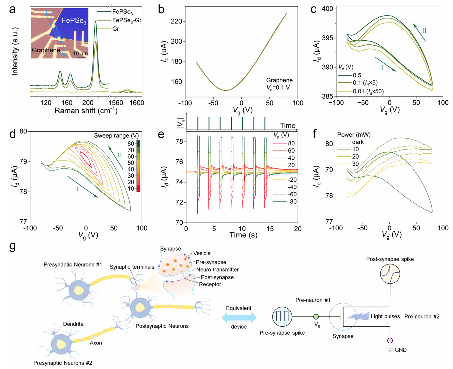 图4. FePSe₃-Gr人工突触器件的表征与性能测试。(a) FePSe₃-Gr器件的拉曼光谱。对器件不同区域进行拉曼光谱表征,证实FePSe₃-Gr异质结成功构筑。插图为该器件的光学显微图像,其中石墨烯区域与FePSe₃区域分别用蓝色和黄色虚线标出。(b) 原始石墨烯的Id-Vg曲线。观察到预期的"钟形"特征曲线,这是单层石墨烯的典型电学特性。(c) FePSe₃-Gr器件的Id-Vg曲线(在Vd=10-500 mV范围内施加双向扫描Vg(±80 V)测得)显示出相似的迟滞窗口。箭头与数字代表扫描方向与顺序。仅测试石墨烯的Id-Vg曲线,这是因为源漏电极连接于石墨烯两端,未与FePSe₃直接接触。 (d) FePSe₃-Gr器件在Vd=0.1 V时,不同Vg下的Id-Vg曲线显示出记忆窗口。随着Vg增大,记忆窗口逐渐拓宽。(e) 在80至-80 V范围内施加不同幅值的7周期累积Vg脉冲刺激(栅极脉冲宽度400 ms,Vd=0.1 V)下,Id随时间演化曲线。非零的突触后电流证明了电子突触操作的可行性。(f) FePSe₃-Gr器件在暗态及不同功率光照(λ=520 nm)条件下的Id-Vg曲线。随着光功率增强,记忆窗口逐渐缩小直至消失。(g) 典型生物突触系统及其等效电路图。FePSe₃-Gr器件实现了双模态(电学与光学)调控,具备非易失性、多功能及良好的突触可塑性。
