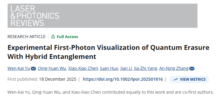 近日,必赢国际437官网必赢国际437官网量子技术研究中心张安宁教授、俞文凯研究员团队在量子成像与量子基础物理研究领域取得重要进展。该团队创新性地结合“首光子成像”技术与“偏振-轨道角动量(orbital angular momentum,OAM)混合纠缠”体系,在平均0.6404个光子/像素的极弱光条件下,成功实现了量子擦除全过程的二维可视化观测。相关成果以“Experimental first-photon visualization of quantum erasure with hybrid entanglement”为题,发表在光学领域国际顶级期刊《Laser & Photonics Reviews》(Laser Photonics Rev. 2025: e01816,IF: 10.0,JCR: Q1,中科院1区Top)。必赢国际437官网为本工作的第一完成单位,合作单位包括盐城师范学院和中国航天科工智能科技研究院。论文共同第一作者为俞文凯研究员、吴清源博士研究生及陈晓晓博士;共同通讯作者为张安宁教授和俞文凯研究员;论文合作者还包括霍娟研究员、李健博士研究生、杨家之博士。该研究工作得到了国家自然科学基金(Grant Nos. 92365115, 12474480, 62571047)的大力支持。