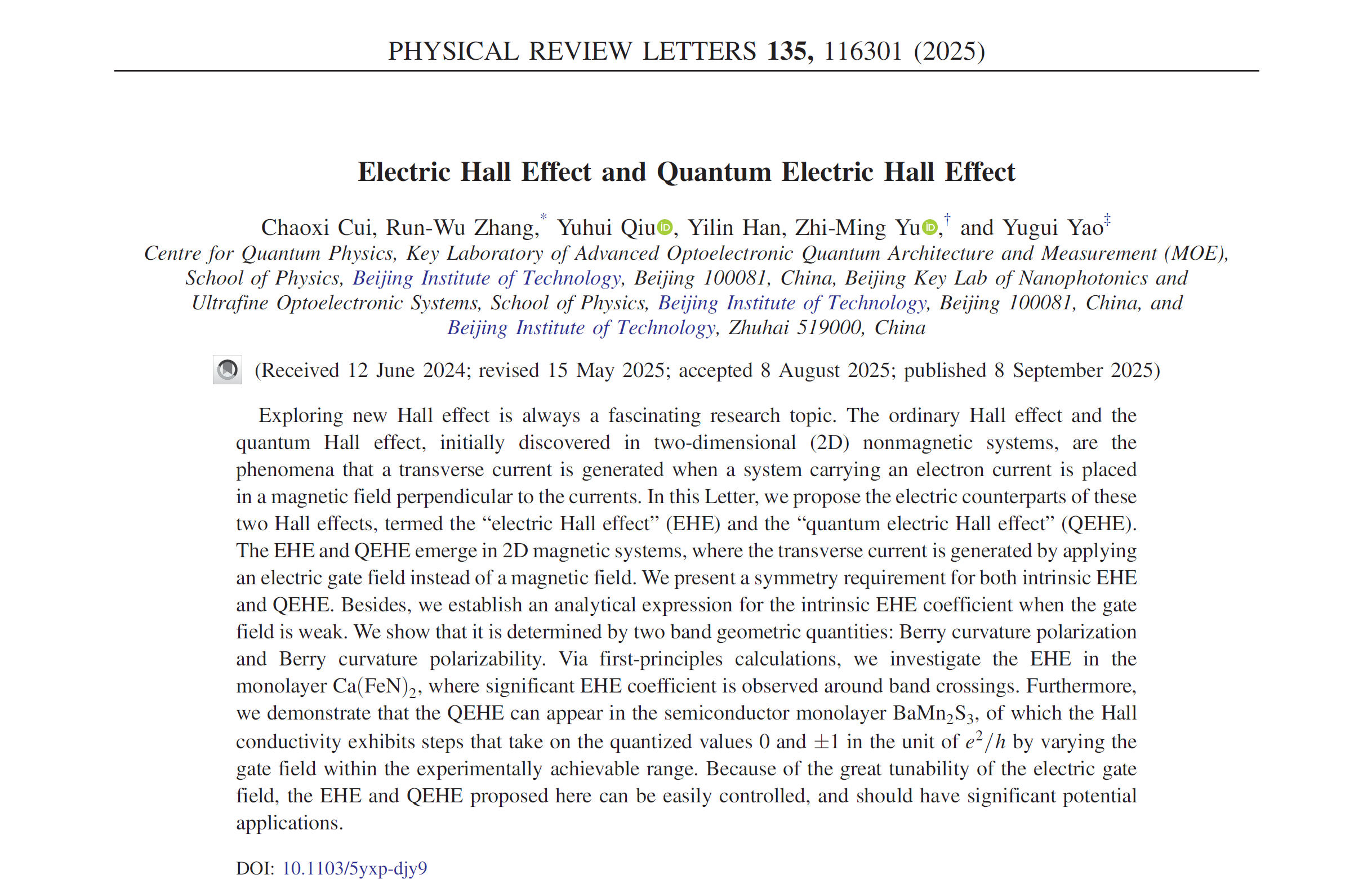 文章信息(*为通讯作者):Chaoxi Cui, Run-Wu Zhang*, Yuhui Qiu, Yilin Han, Zhi-Ming Yu*, and Yugui Yao*, “Electric Hall Effect and Quantum Electric Hall Effect”, Phys. Rev. Lett. 135, 116301 (2025).