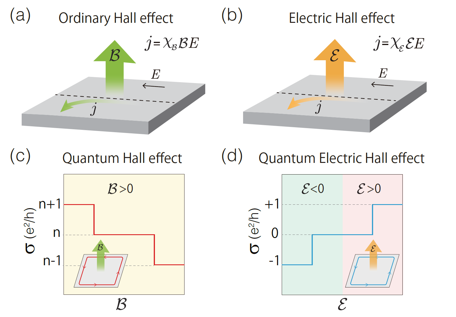 图1:(a) 常规霍尔效应,(c) 量子霍尔效应;(b)与(d) 分别展示了电霍尔效应和量子电霍尔效应,它们可被视为常规霍尔效应与量子霍尔效应的电场对应。
