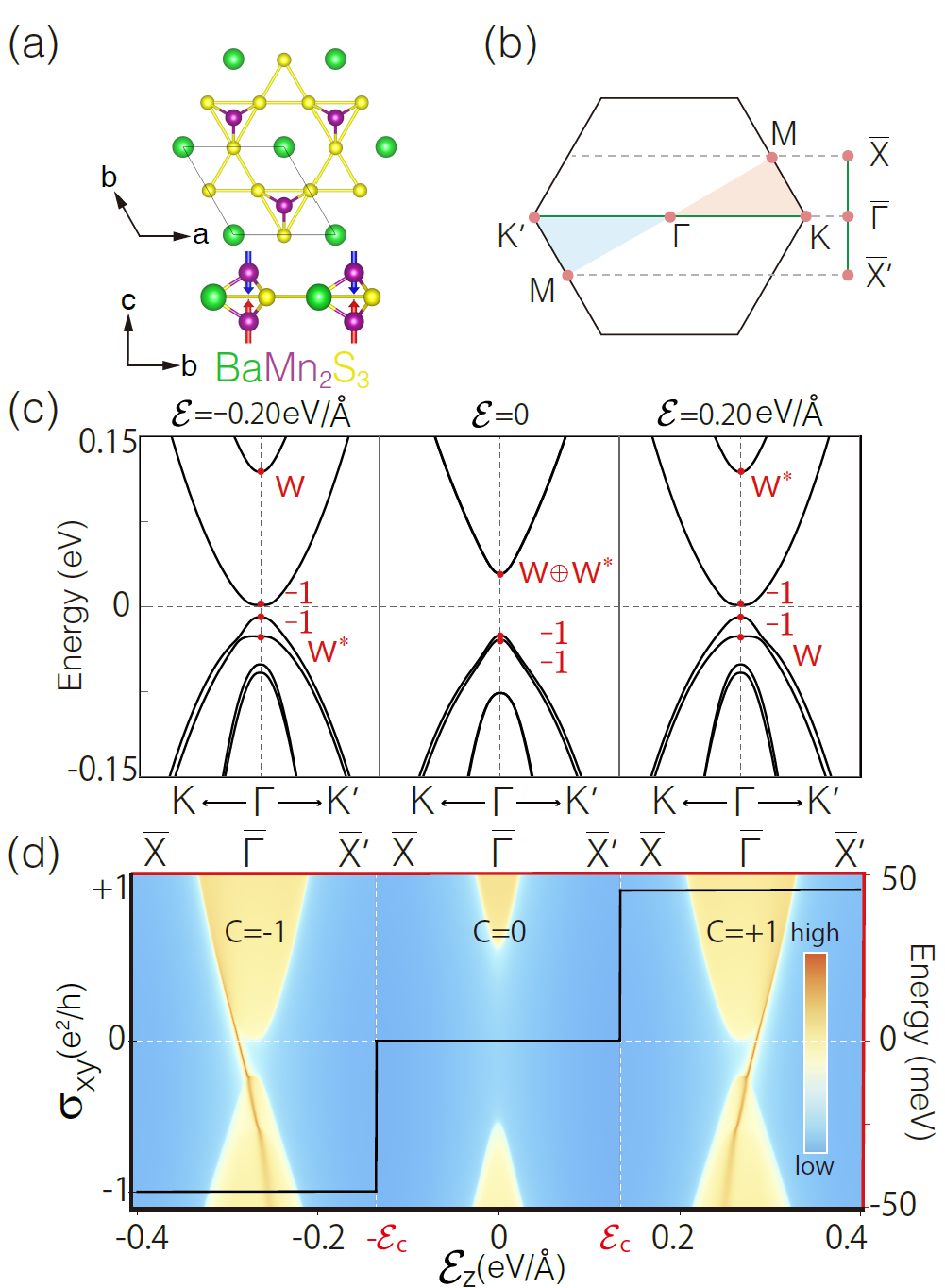 图3:单层BaMn2S3 的(a)结构示意图及(b)布里渊区;(c) BaMn2S3 在不同垂直电场Ɛz =0,±0.2 eV/Å 下考虑自旋轨道耦合时的能带结构。Γ 点能带的C3z 本征值以红色标注,其中W =e^-iπ/3;(d)BaMn2S3 的内禀霍尔电导率σxy(左轴)随垂直电场Ɛz(下轴)的变化关系。图中还以背景方式绘制了在Ɛz = 0,±0.2 eV/Å 下的(10) 边缘态(上轴与右轴)。
