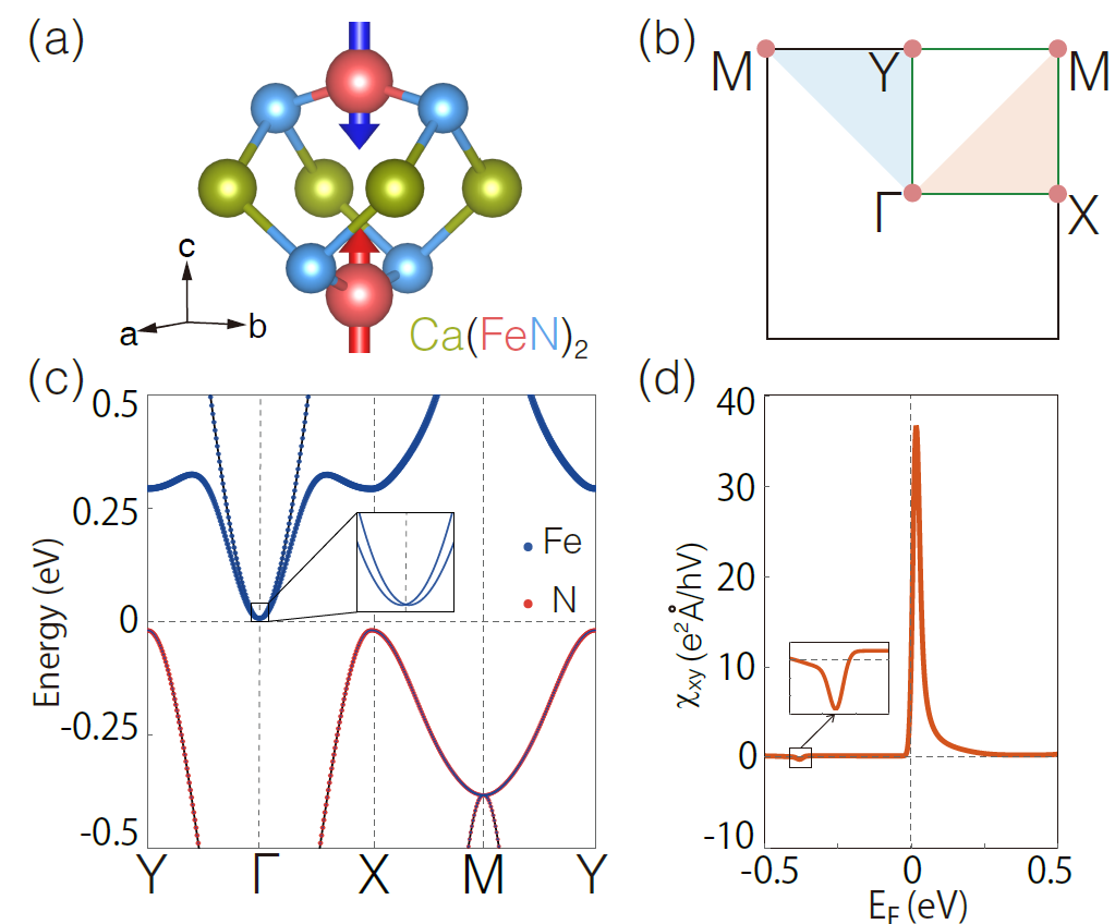 图2:单层Ca(FeN)2 的(a)结构示意图与(b)布里渊区;(c)考虑自旋轨道耦合下的Ca(FeN)2 的轨道投影能带结构,插图显示了在Γ 点处的线性色散的能带交叉;(d)χxy 随费米能级EF 的变化关系,插图展示了源自M 点处线性外尔点的小峰值。此处采用的gE = 0.23,其数值来自第一性原理计算。